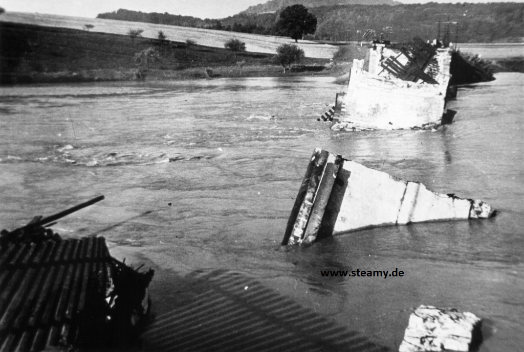 Dem durch die Bombadierung der Ederseesperrmauer am 17.05.1943 ausgelösten Hochwasser konnte die Brücke nicht standhalten. Blick Richtung Haldorf.