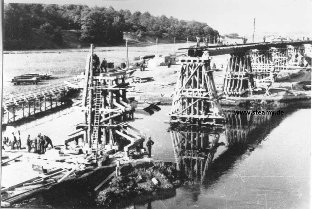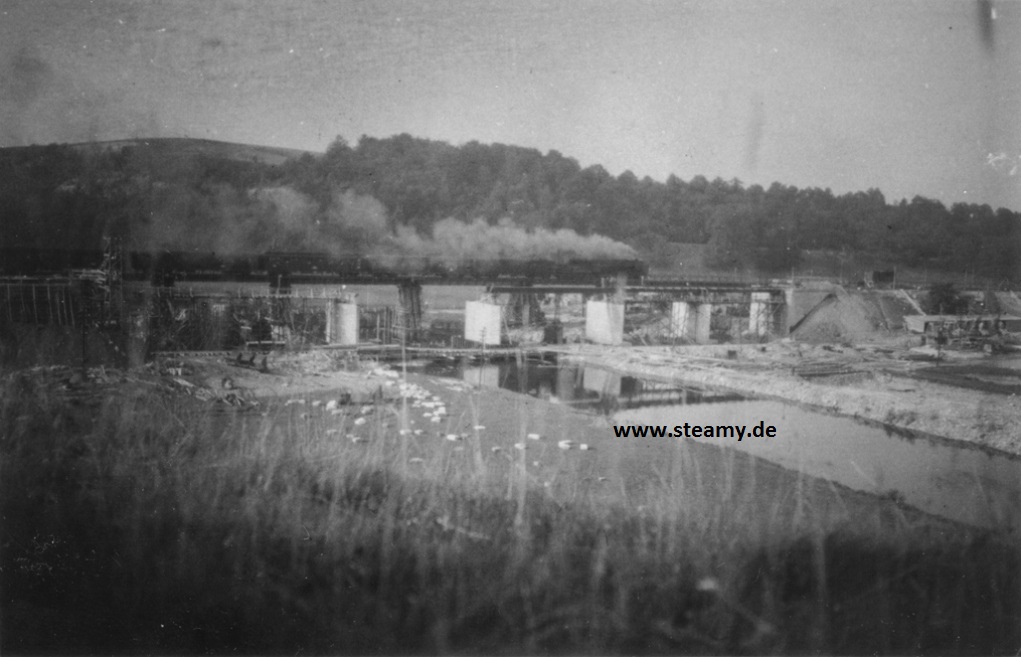Das Bild Zeigt einen Zug Richtung Kassel auf der Behelfsbrücke. Davor hat der Wiederaufbau der Brückenpfeiler und des Brückenkopfs durch die Organisation TODT noch während des Krieges begonnen. Foto: Ernst Schramm