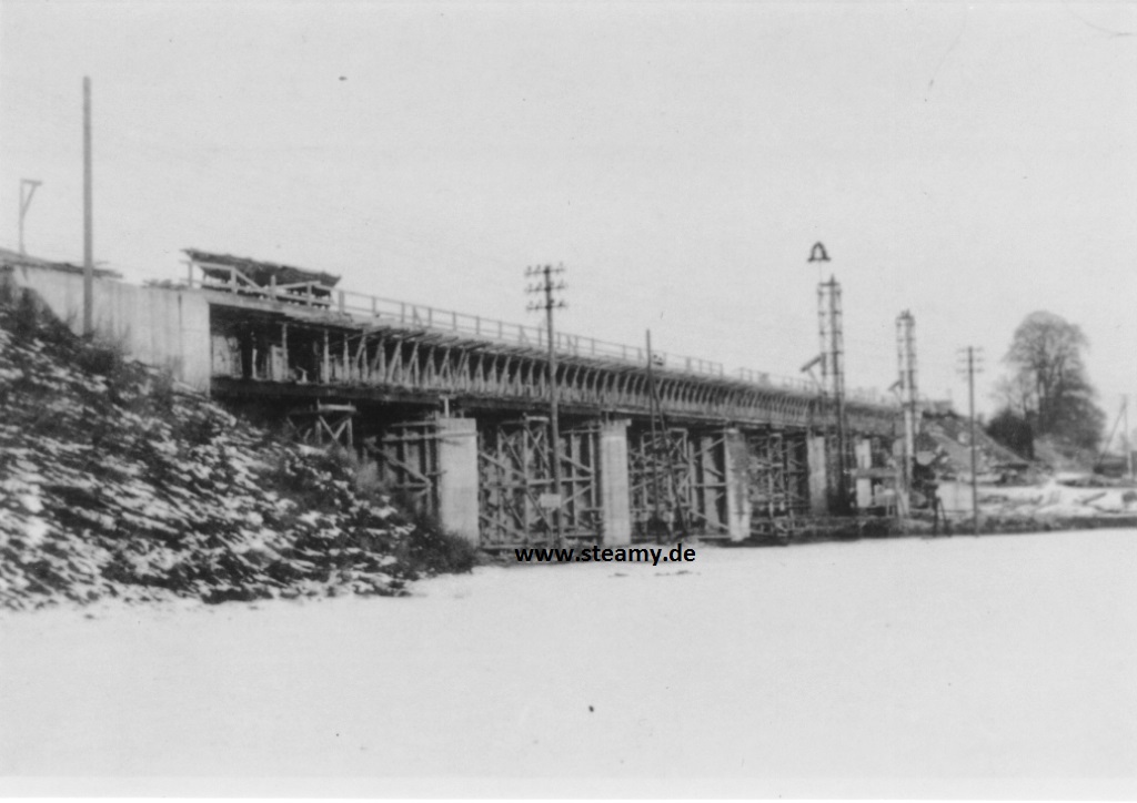 Der Wiederaufbau als erste Spannbeton-Eisenbahnbrücke Deutschlands wurde 1950 fortgesetzt und 1951 vollendet.