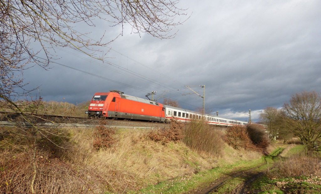 Etwas weiter südlich ergibt sich diese Perspektive. Am 29.12.2013 strebt 101 095-8 um 13:14 Uhr mit ihrem IC vor