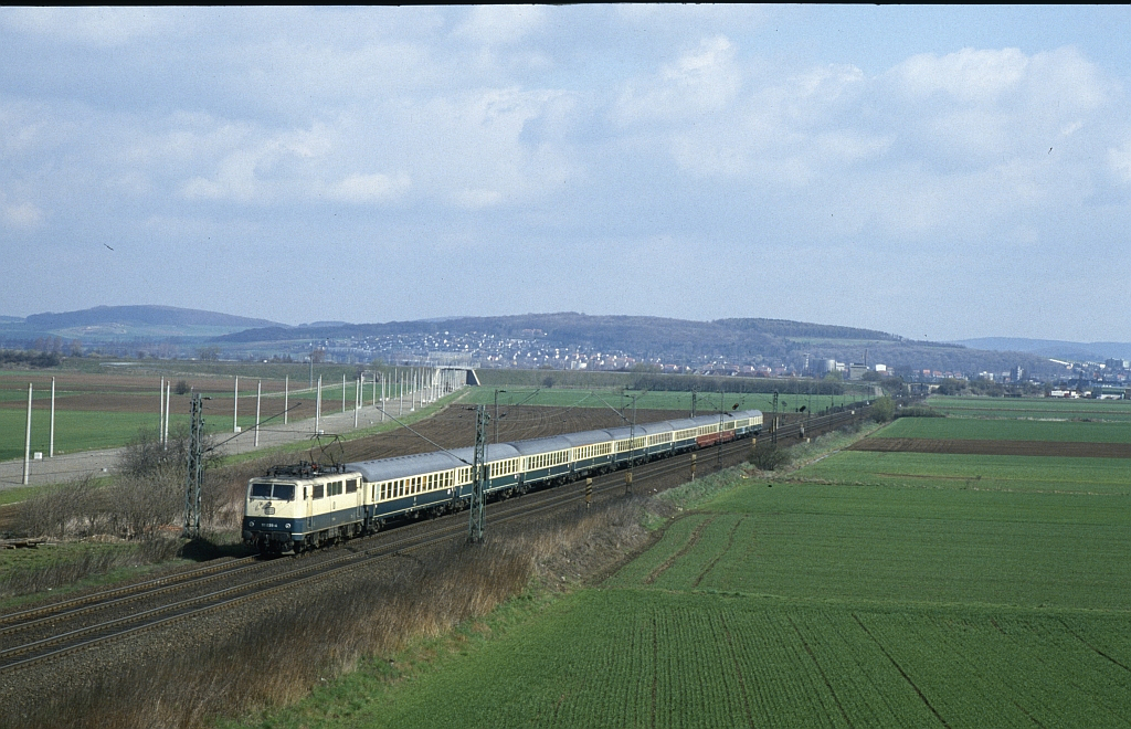 Bei Nörten- Hardenberg fährt 111 039 mit dem D771 am 20. 04.1987 nach Süden. Die Trasse der NBS ist deutlich erkennbar, im Hintergrund liegt Northeim.