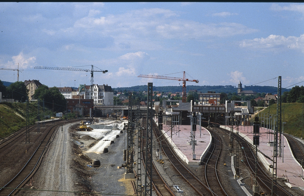 | Halbzeit in Wilhelmshöhe: die Osthälfte ist schon fertig, im Westen entstehen die Fernbahnsteige. Juni 1988 |