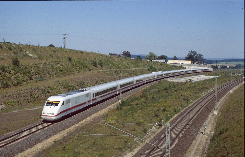 Auch das gab es gleich am Anfang: im Juli 1991 entgleiste ein Güterwagen und beschädigte die Betonschwellen der NBS. Die schnellen Renner mußten deshalb ab Ihringshausen die alte Route nach Wilhelmshöhe nehmen. Schön für die Fotografen, denn so kamen alle Züge über diese "Paradestrecke", statt in den Tunnel abzutauchen. |