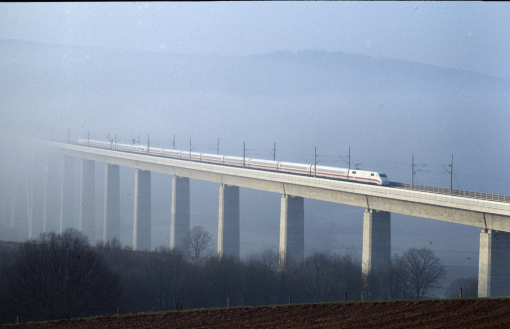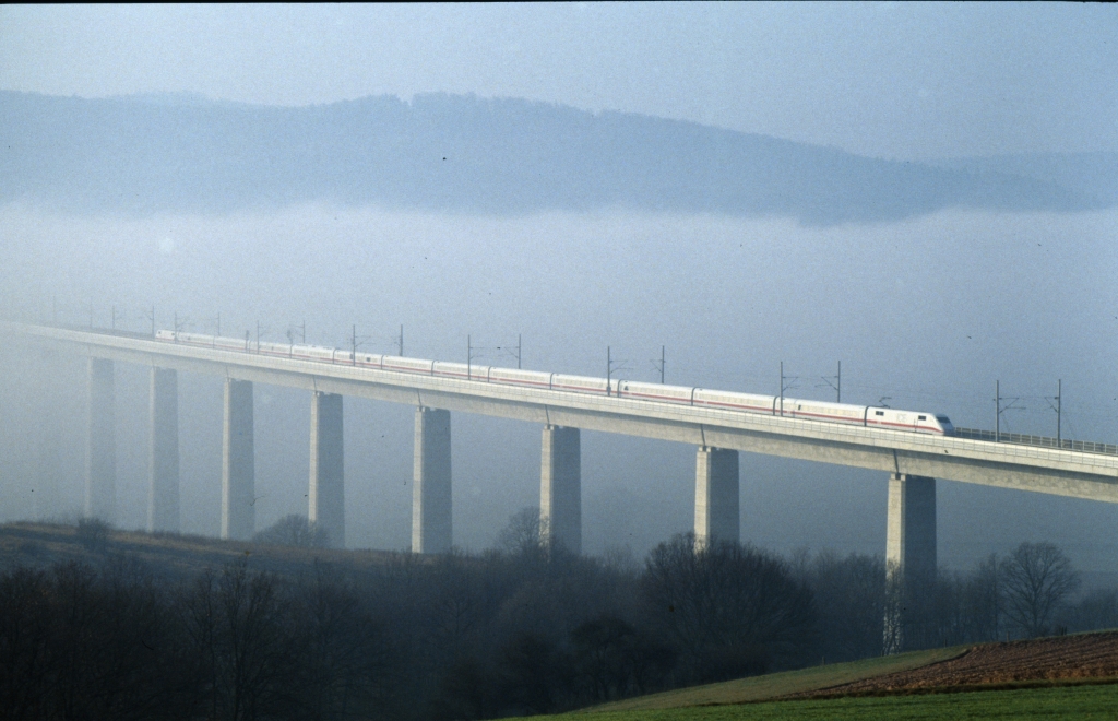 Am späten Vormittag lichtete sich der Nebel. Ein unbekannter ICE rauschte gen Norden.