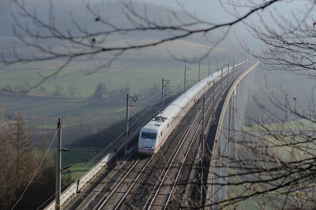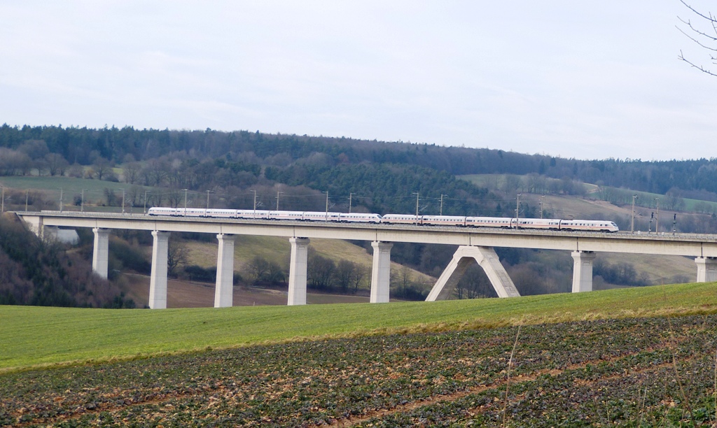 Am Valentinstag 2015 rauscht ein ICE Richtung Norden über das Pfieffetal.