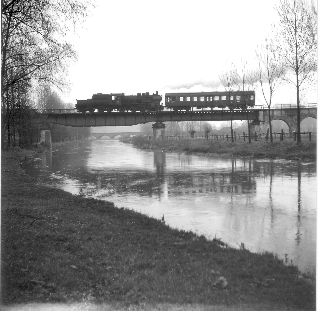 Wegen Hochwassers wurden im Januar 1966 die Busse durch Züge ersetzt! Die Aufnahme entstand an der Warburger Diemelbrücke am 3.1.1966 (Foto: Reinhard Todt) |