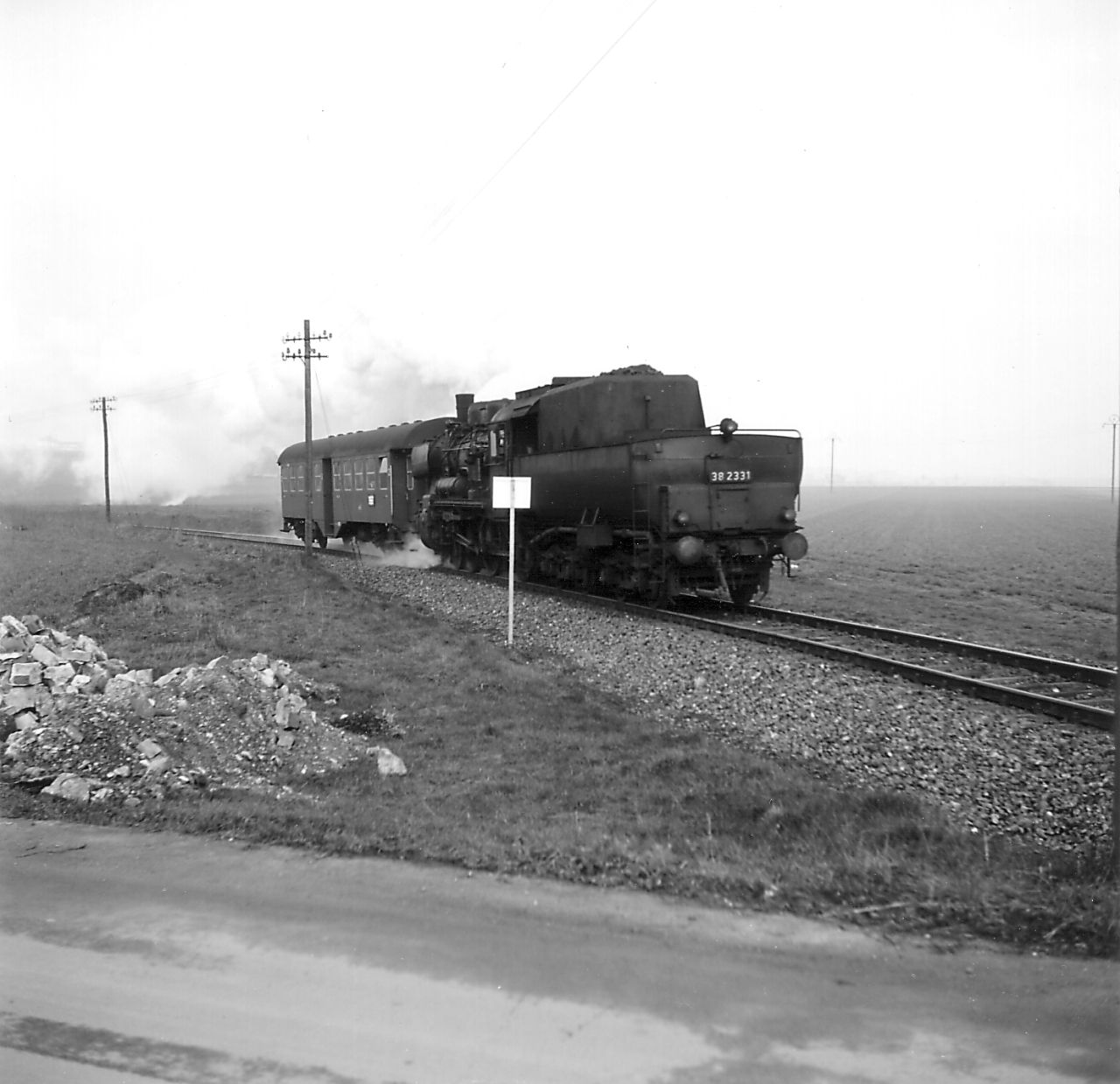 Mit dem einzigen Personenzug der Strecke kommt die Bestwiger 38 2331 daher- aufgenommen früh morgens in der Einfahrt von Warburg/Westf. von Reinhard Todt im April 1965 |